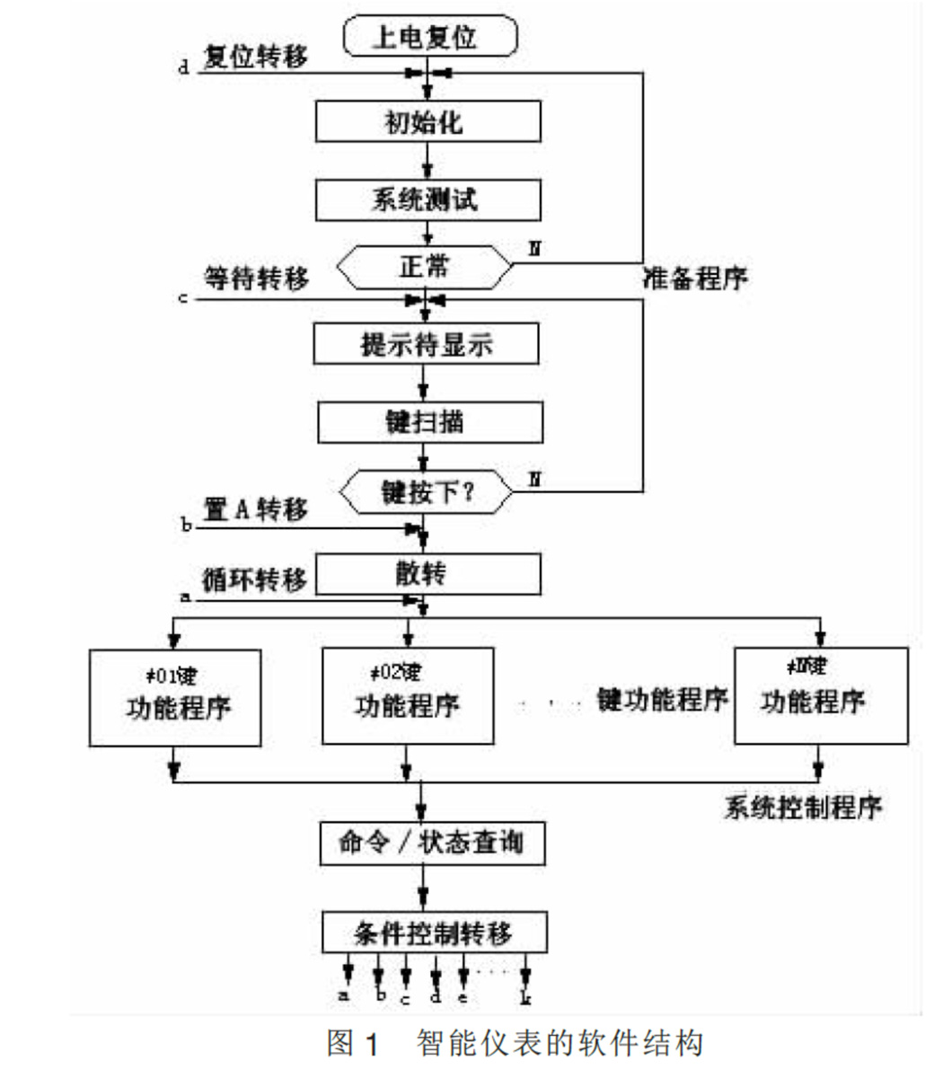 智能儀表是一種較完整的單片機應用系統。一般硬件電路除基本擴展部分外,都配置有采集電路、顯示器、按鍵、打印機等。相應的軟件有采集、采集控制、數據處理、顯示、結果打印等。圖一是智能儀表的一種典型軟件結構。按其功能,可分為三部分,即準備程序、鍵功能程序和系統控制序。