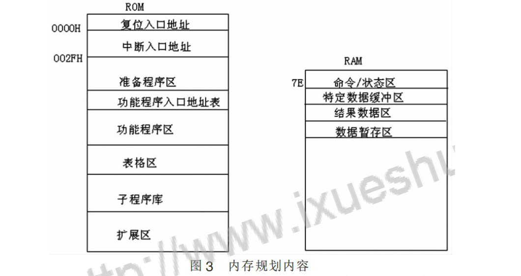 與軟件結構設計相配合,必須將程序存儲器(ROM)和數據存儲器(RAM)實現規劃。按照上述的軟件結構,ROM、RAM 規劃內容如圖三所示。圖中除了個別特定區域外,對于一個具體的智能儀表,每個部分規定的區域范圍不同,既要考慮系統的程序構成,還要考慮到二次開發的擴展余地。