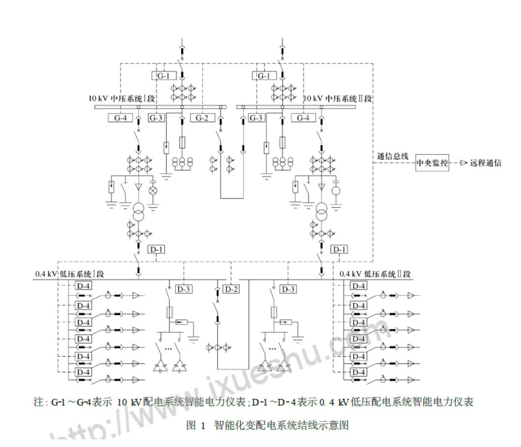 隨著國(guó)民經(jīng)濟(jì)的高速發(fā)展和先進(jìn)科技在民用建筑領(lǐng)域的普遍應(yīng)用,民用建筑工程已經(jīng)開始逐漸向智能化方向發(fā)展。配電系統(tǒng)作為建筑物實(shí)現(xiàn)智能化的一個(gè)基本要素,同樣要求實(shí)現(xiàn)智能化。智能化變配電系統(tǒng)一般由智能型配電開關(guān)柜、通信總線和后臺(tái)管理中心構(gòu)成,并與建筑物BA系統(tǒng)聯(lián)網(wǎng)。系統(tǒng)典型結(jié)線示意圖如圖1所示。